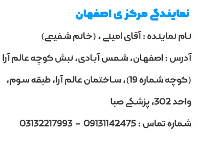 آدرس : اصفهان، شمس آبادی، نبش کوچه عالم آرا (کوچه شماره ۱۹)، ساختمان عالم آرا، طبقه سوم، واحد ۳۰۲، پزشکی صبا